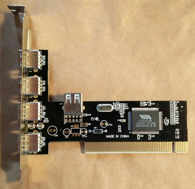 You get what you pay for. Buy cheap, buy twice. I’ve heard them all before. But a couple of my old-but-useful Linux PCs needed an upgrade to high speed USB recently, and I didn’t want to spend much. A quick search on allegro.pl (the Polish equivalent of eBay) turned up just what I was looking for. USB 2.0 adapter cards to fit the now-retro PCI bus, for just 20 złoty, or a bit less than four quid in old money. “Five USB 2.0 ports”, exclaimed the advert, in Polish. “Four external and one internal”. Perfect – I wanted to connect an internal card reader so the internal port was just the ticket.